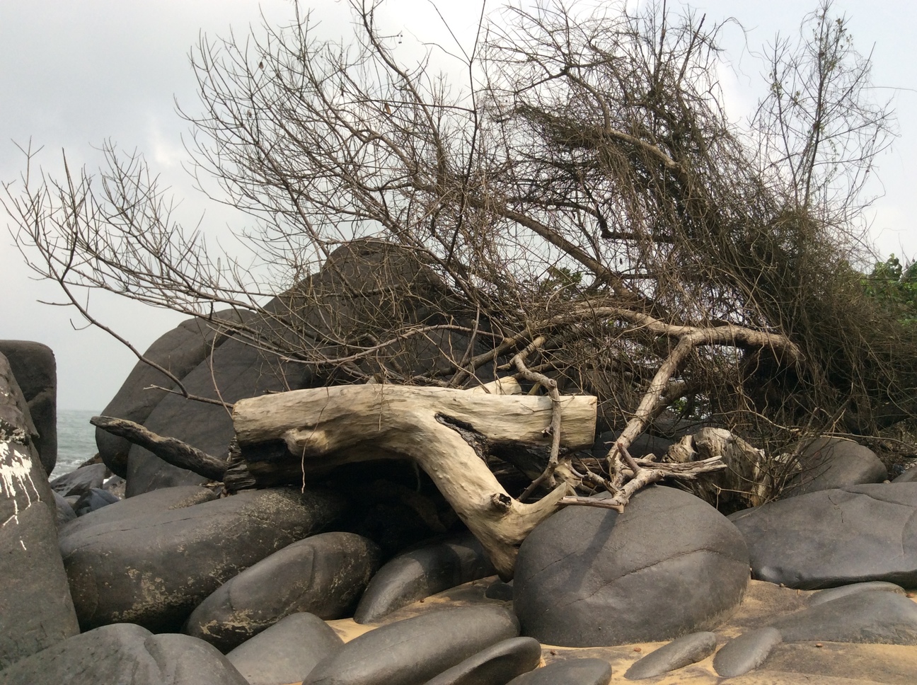 Embarqués à Ureca, la sombre plage de Bioko, qui est l’ancienne Ilha Formosa du portugais Fernando Póo, ils naufragèrent j’imagine, bien qu’une petite distance sépare du continent le surplomb volcanique. Je crois que ce sont eux, ici, morts de s’être exténué, sur les rochers qu’entourent leurs bras en geste familier, en étreinte discrète, car ils furent d’heureux amants, hélas contraints à fuir un jugement pervers.